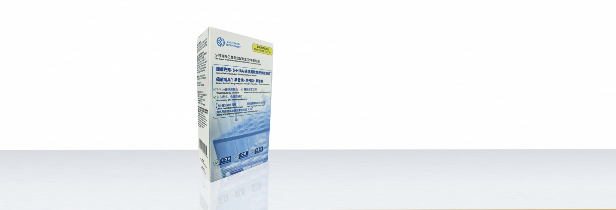 5-羥吲哚乙酸 (“5-HIAA”) 作為人體重要的代謝標誌物,其濃度變化與細胞異常增殖活動密切相關。 當細胞異常增殖引發應激反應時,會導致色氨酸、酪氨酸等氨基酸代謝異常,使尿液中5-HIAA及其代謝衍生物含量顯著升高。 本產品基於化學顯色法原理,通過檢測晨尿中5-HIAA濃度變化,與試劑發生特徵性顯色反應, #3-5分鐘內即可通過與標準比色板對比獲得結果(陰性 / 弱陽性 / 陽性)。